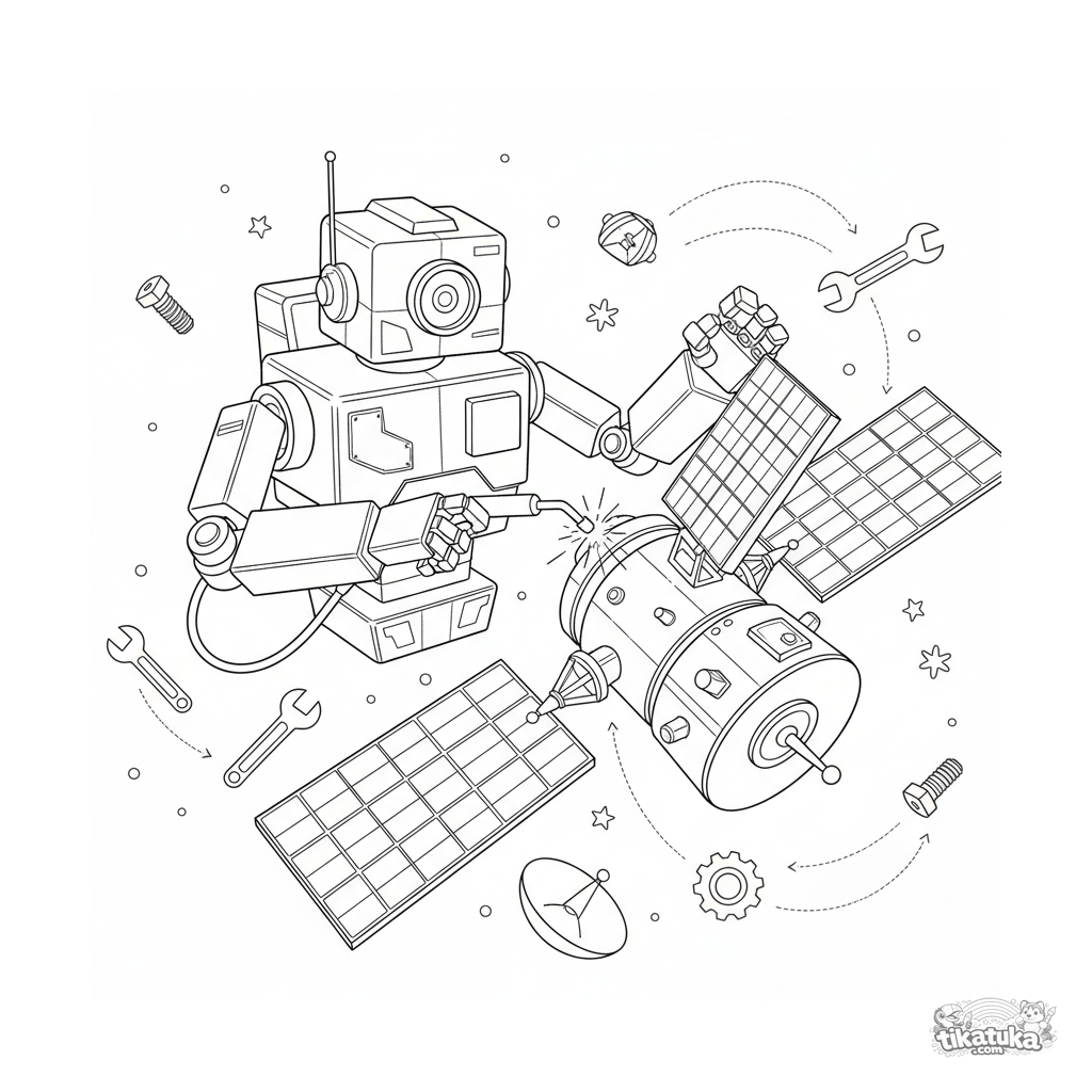 Detailliertes Ausmalbild für ältere Kinder 10-12: Ein komplexer Roboter-Mechaniker repariert einen Satelliten im Weltraum. Technischer Blaupausen-Stil, viele Linien, interessant für Technik- und Weltraumfans.