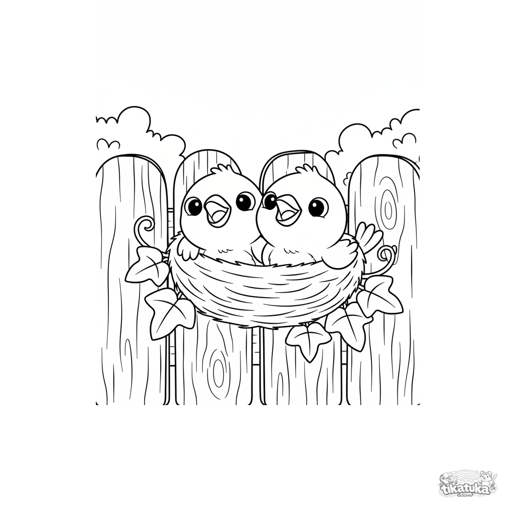 Ausmalbild für Kinder 4-6: zwei flauschige Spatzenküken lugen aus einem Nest in einem Gartenzaun hervor.