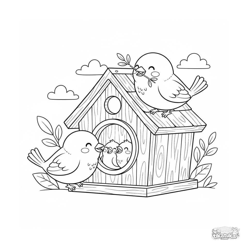 Ausmalbild für Kinder 4-6: eine Spatzenfamilie in einem Holzvogelhaus. Die Mutter füttert flaumige Küken, während der Vater einen Zweig bringt. Süße Frühlingsnist-Szene.