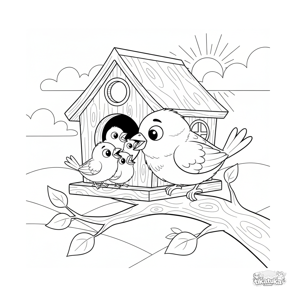 Ausmalbild für Kinder 4-6: eine Spatzenfamilie in einem Holzvogelhaus. Ein erwachsener Vogel füttert drei hungrige Küken.
