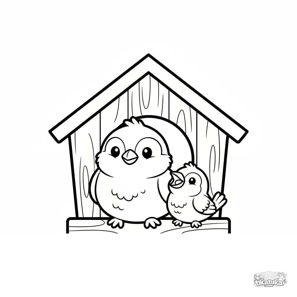 Ausmalbild für Kleinkinder von 2-3 Jahren: ein Spatz mit einem Küken in einem gemütlichen Holz-Vogelhaus. Einfache, große Formen und breite Ränder.