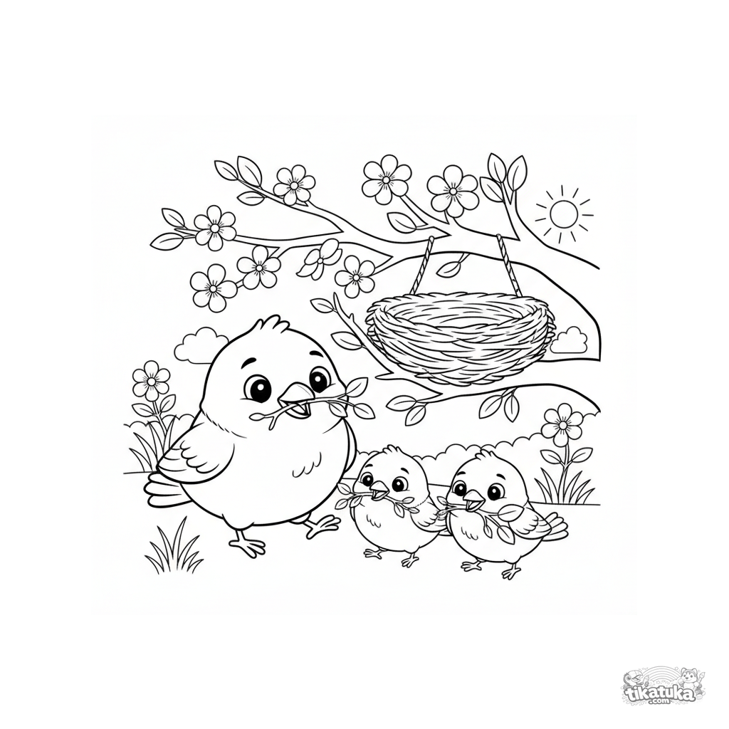 Ausmalbild für Kinder 4-6: Eine Spatzenfamilie baut ein Nest im Garten. Eine kindgerechte Szene mit flauschigen Jungvögeln.