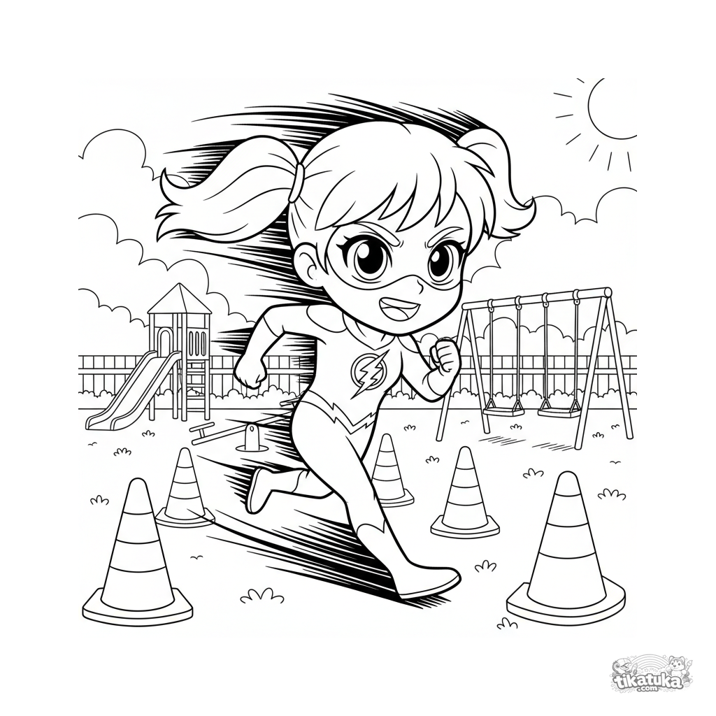 Ausmalbild für Kinder 4-6: Ein Geschwindigkeits-Superheld trainiert auf einem Hindernisparcours auf dem Schulhof und hinterlässt eine Bewegungsunschärfe.
