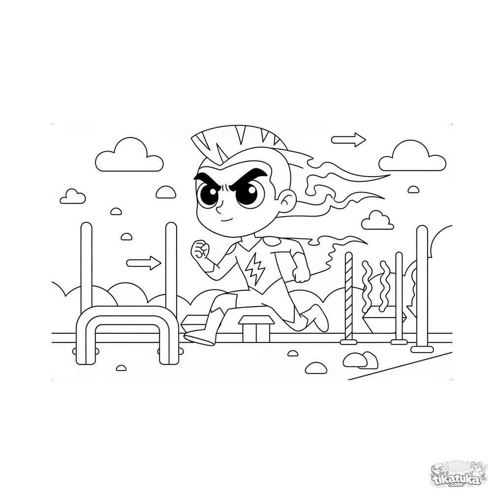 Ausmalbild für Kinder 4-6: Ein Geschwindigkeits-Superheld als Bewegungsunschärfe rennt durch einen hellen Trainingsparcours. Dynamische Actionszene.