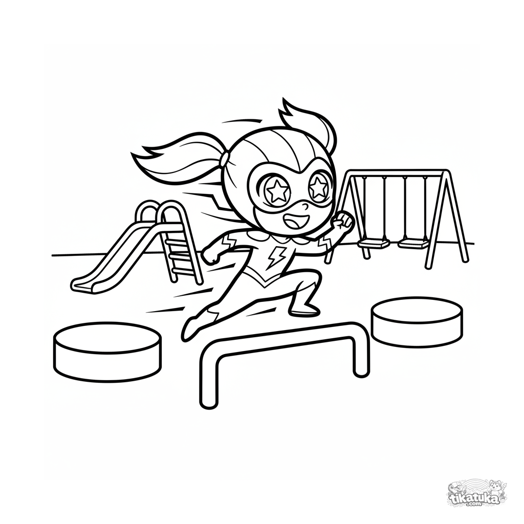 Einfaches Ausmalbild für Kleinkinder 2-3: Ein fröhlicher Geschwindigkeitsheld rennt durch einen Hindernisparcours auf dem Schulhof. Dynamisch, aber mit großen Formen.