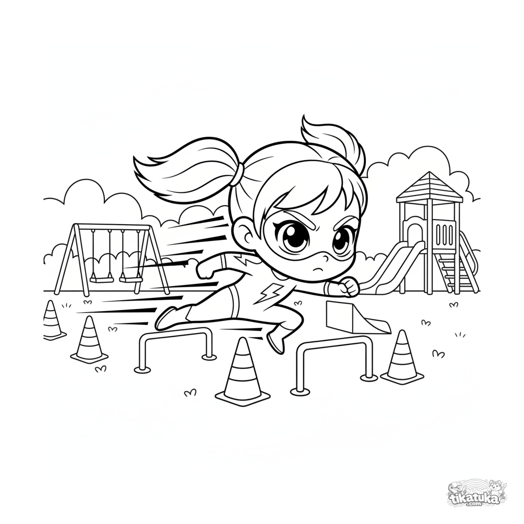 Ausmalbild für 7-9 Jahre: Ein Geschwindigkeitsheld im dynamischen Manga-Stil flitzt durch einen Hindernisparcours auf einem Schulhof. Energiereiche Szene mit Geschwindigkeitslinien.