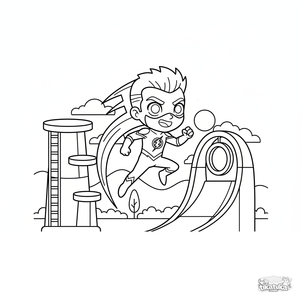 Ausmalbild für Kinder 7-9: Ein Geschwindigkeits-Superheld springt über einen farbenfrohen Hindernisparcours im Freien.