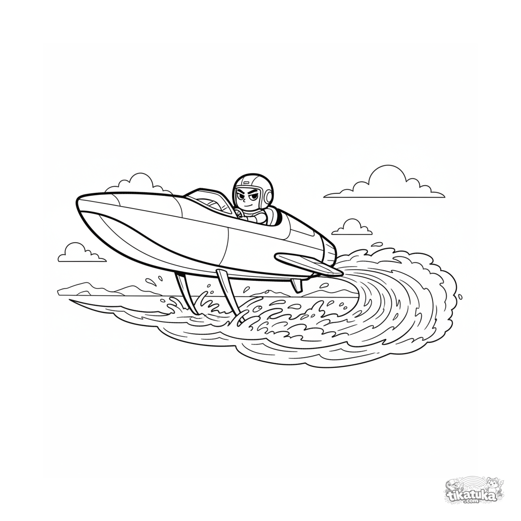 Ausmalbild für Tweens 7-9: ein schnelles Tragflügelboot rast über das Meer, wobei der Rumpf über dem Wasser schwebt.