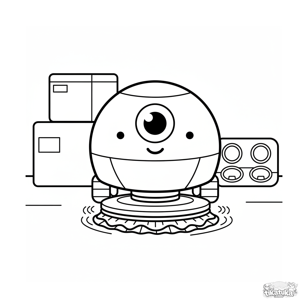 Kleinkinder-Ausmalbild: Ein einfacher kugelförmiger Reinigungsroboter mit einem Auge poliert den Boden in einem Lagerhaus. Sehr einfache geometrische Formen, große Details, breite Ränder.