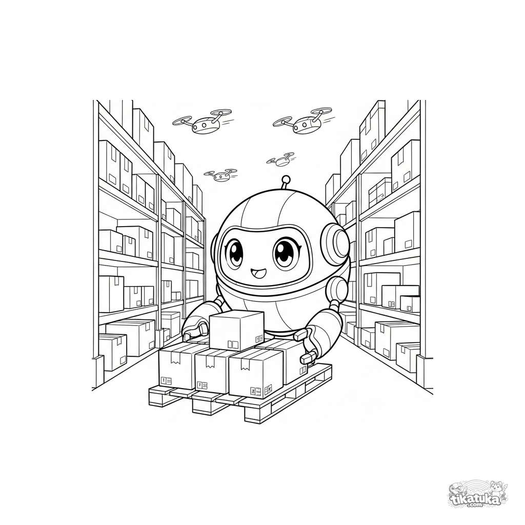 Kinder Ausmalbild: Ein fröhlicher Kugelroboter rollt eine beladene Palette zwischen Lagerhausregalen, Drohnen flitzen vorbei. Helle, klare Illustration.