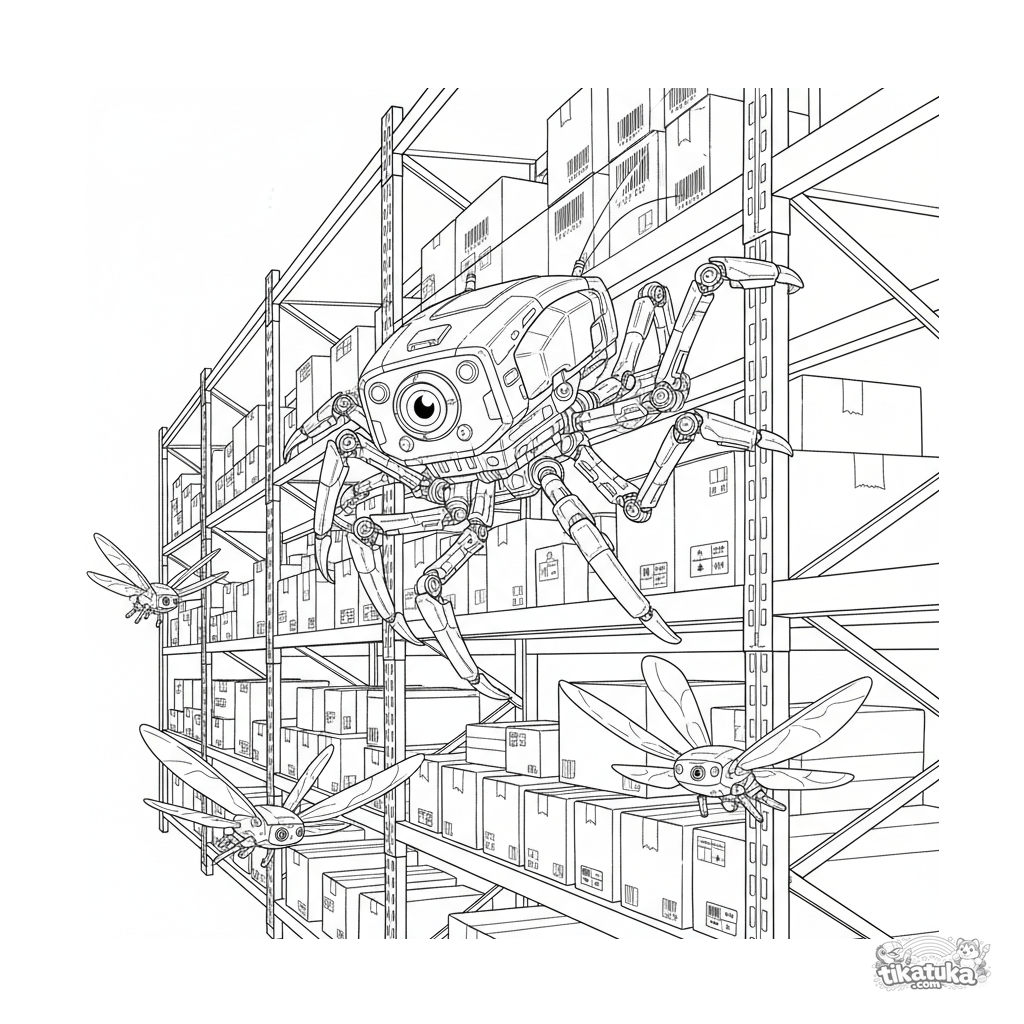 Komplexe technische Ausmalbild für ältere Kinder 10-12: Ein mehrbeiniger Spinnenroboter klettert an bis zur Decke reichenden Lagerregalen hoch und scannt Strichcodes auf Kartons, während unten in den Gängen Drohnen fliegen.