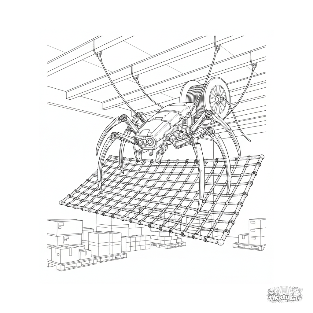 Komplexes Ausmalbild für ältere Kinder 10-12: Ein eleganter Spinnen-Roboter, an Lager-Deckenbalken aufgehängt, webt ein Sicherheitsnetz aus Kabel. Technische Details und Perspektive.