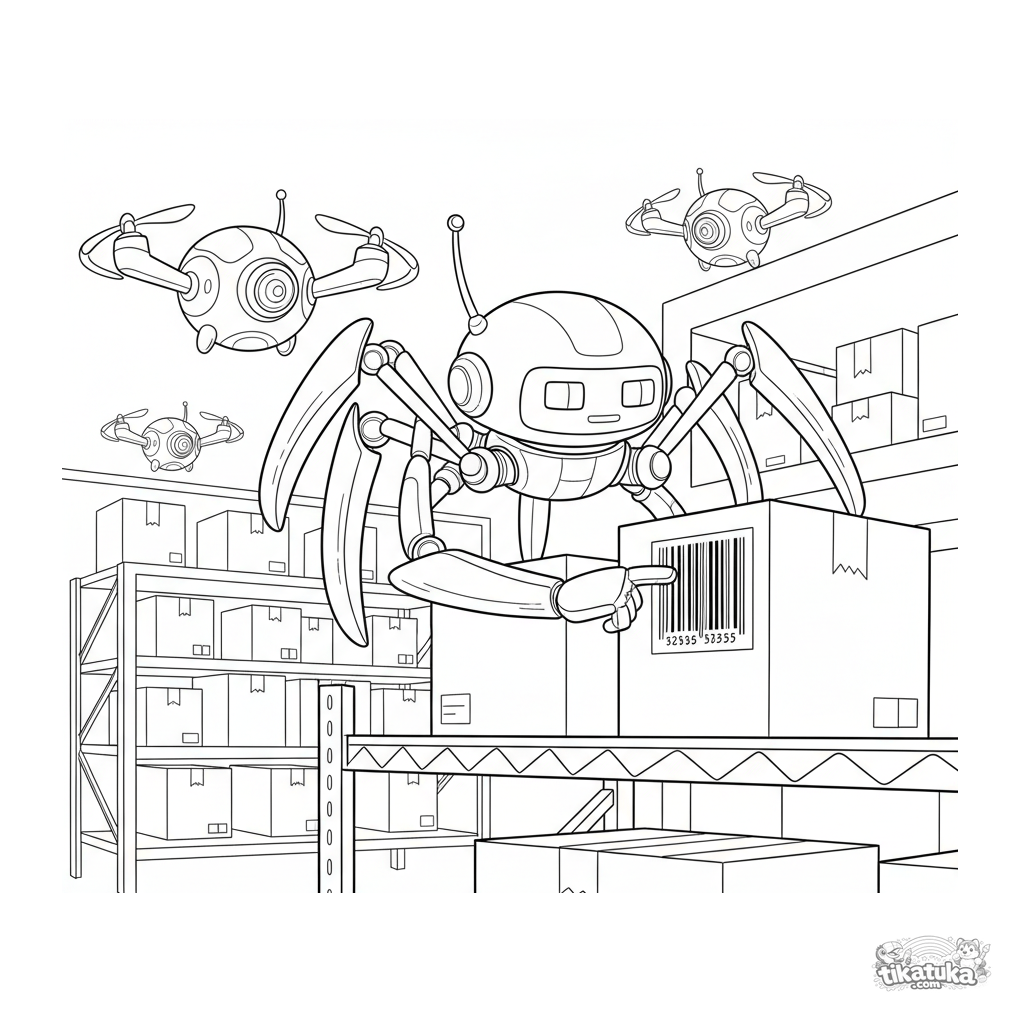 Ausmalbild für Schulkinder 7-9: Ein mehrbeiniger Spinnen-Roboter mit einer Kamerakuppel scannt einen Barcode auf einer Kiste in einem hohen Lagerregal, mit schwebenden Drohnen im Hintergrund. Mäßiges Detail.