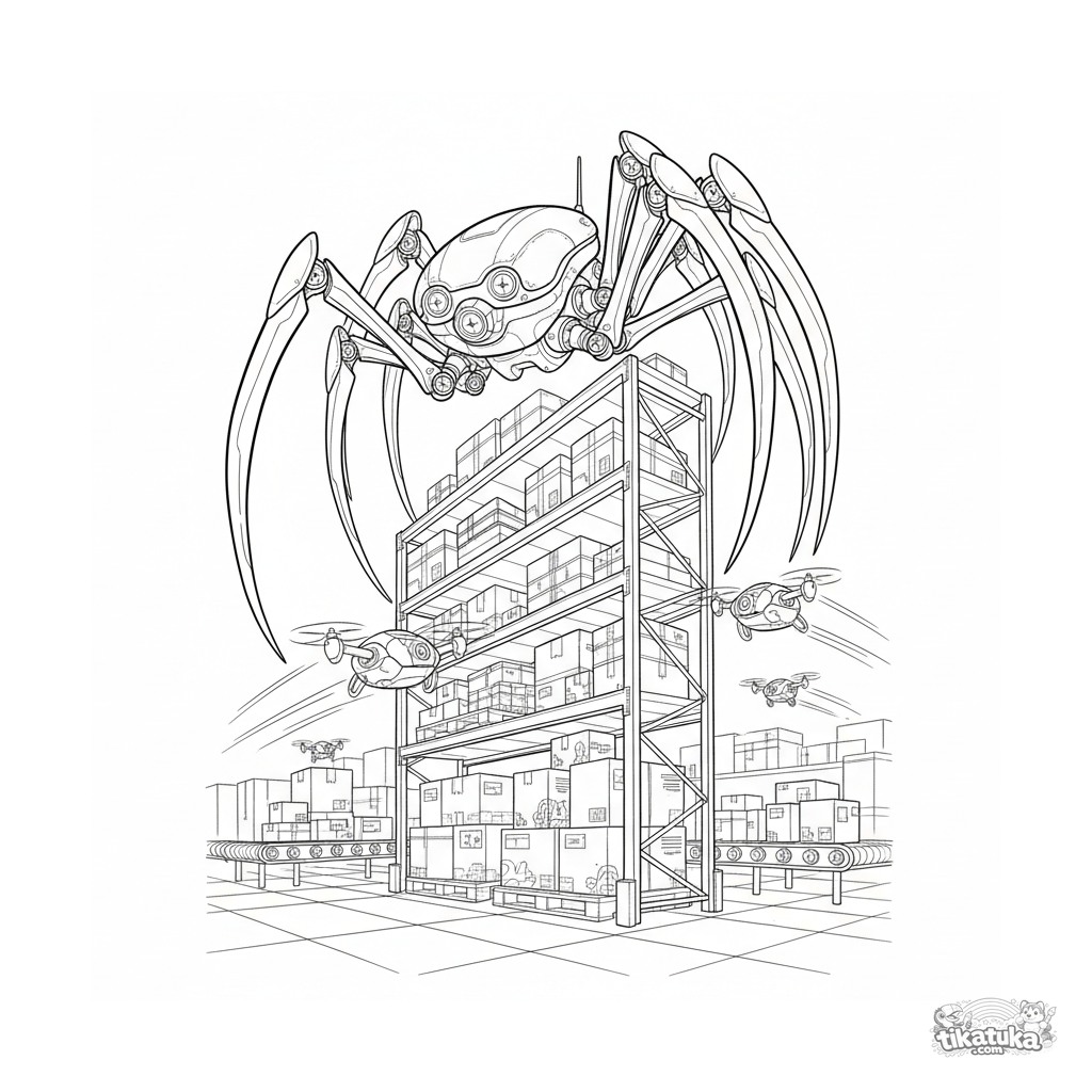 Komplexes Ausmalbild im technischen Stil: Ein Spinnen-Mech auf einem Regal scannt ein Lagerhaus mit Drohnen. Für Kinder von 10-12 Jahren.