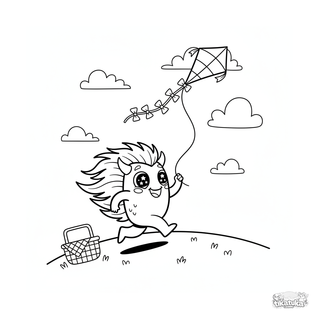 Ausmalbild für Kinder 4-6 Jahre: ein fröhliches stacheliges Monster rennt einen Hügel hoch und lässt einen gestreiften Drachen steigen. Dynamische Szene.