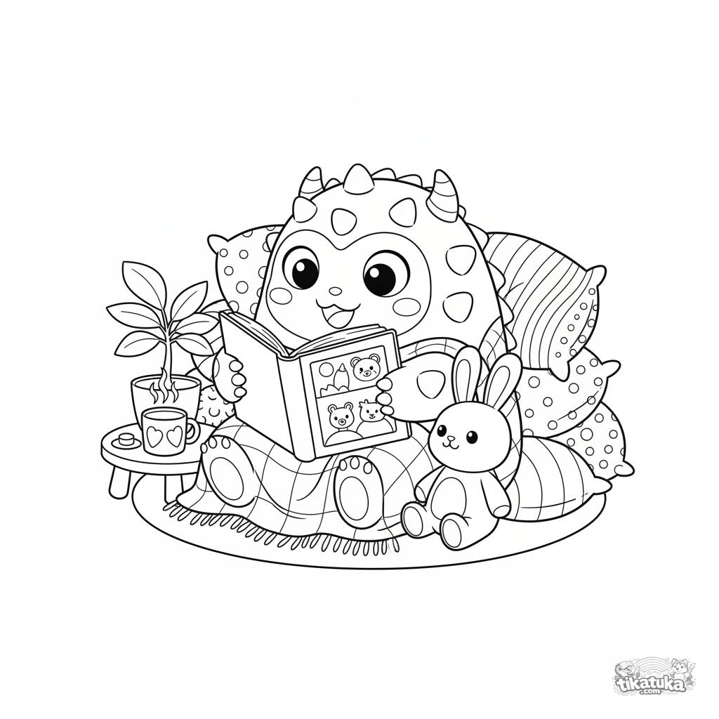 Ausmalbild für Kinder: Ein stacheliges, aber süßes Monster mit großen Augen liest einem Stoffhasen in einer gemütlichen Ecke ein Bilderbuch vor. Warme Szene.