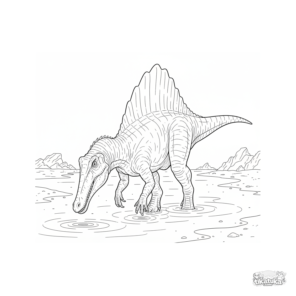 Komplexes realistisches Ausmalbild für 10-12 Jahre: Ein Spinosaurus jagt Fische in einer flachen Lagune eines uralten Ozeans. Detaillierte Anatomie und Naturlandschaft.