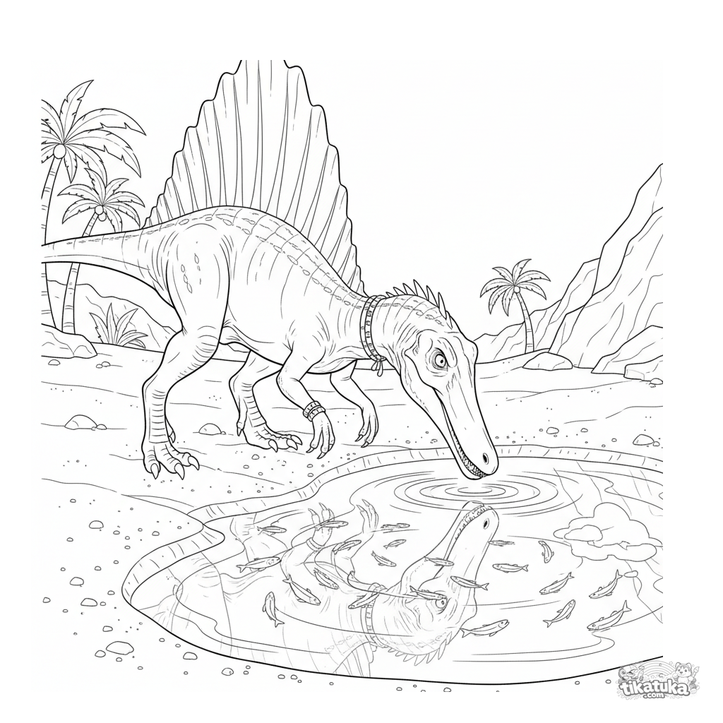 Komplexes Ausmalbild für 10-12 Jahre: Ein realistischer Spinosaurus jagt Fische in einer Gezeitenpfütze an einem uralten Strand.