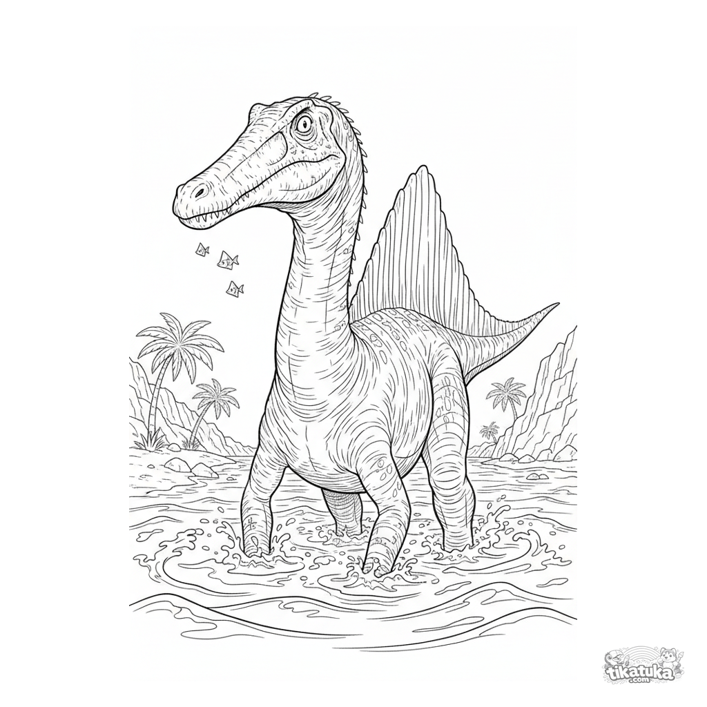 Komplexes Ausmalbild für 10-12 Jahre: Ein Spinosaurus watet in die Brandung eines uralten Ozeans, um nach Fischen zu jagen. Detaillierte, realistische Darstellung mit Wellen.
