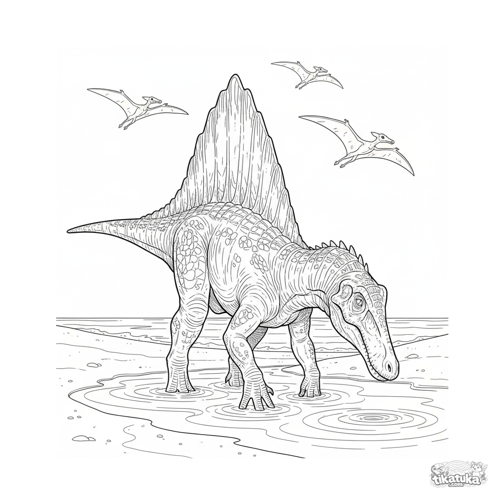 Detailliertes Ausmalbild für Kinder von 10-12 Jahren: Ein Spinosaurus watet im flachen Wasser vor dem Sandstrand des urzeitlichen Ozeans.