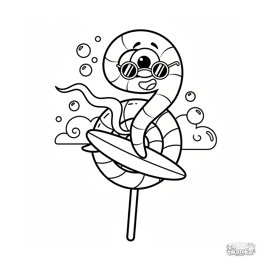 Ausmalbild für 7-9 Jährige: Ein lustiges Spiralbakterium mit Sonnenbrille surft einen riesigen Lollipop hinab. Dynamische Pose, lustiges Thema.