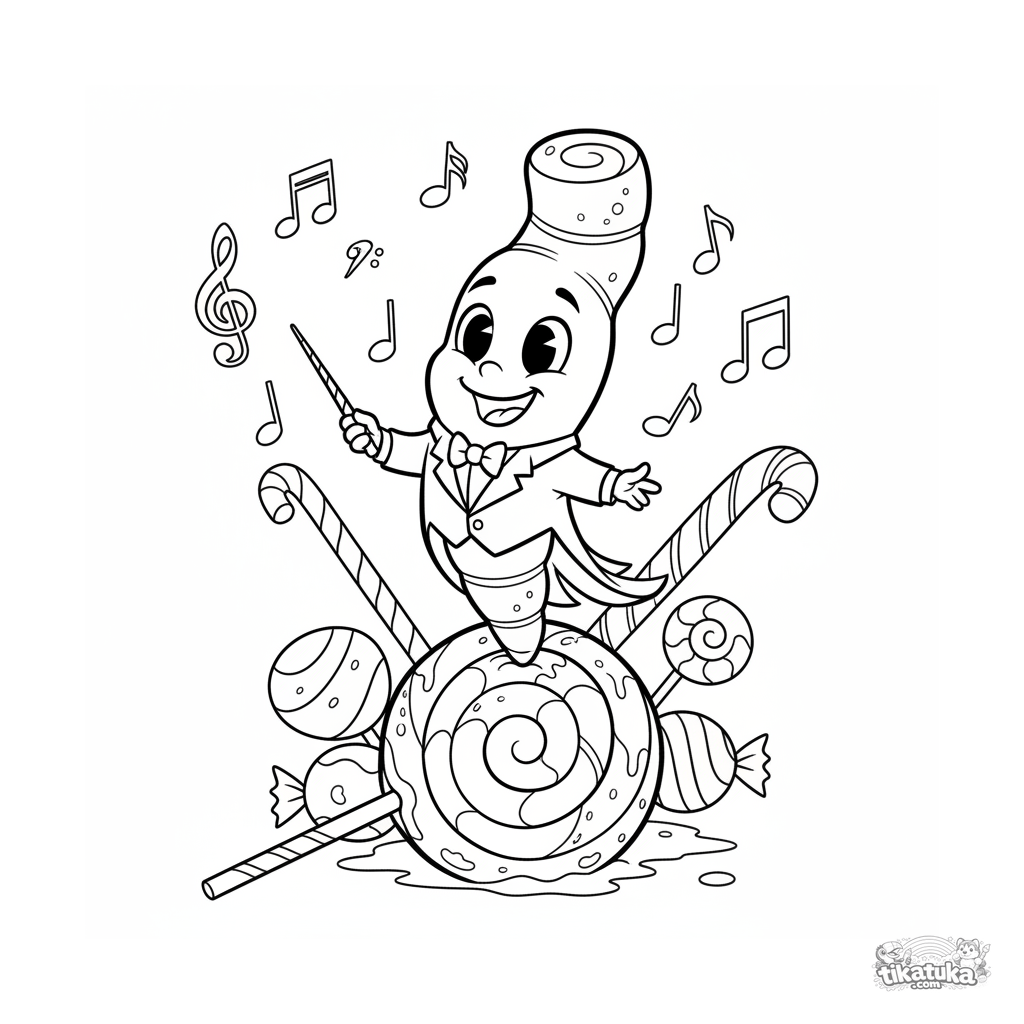 Ausmalbild für Kinder 4-6: Eine fröhliche spiralförmige Mikrobe im Smoking dirigiert ein Orchester auf der Oberfläche eines hellen Lollipops.