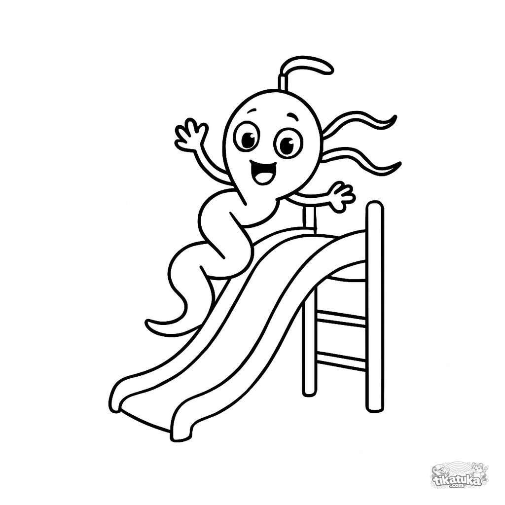 Ausmalbild für Kinder. Fröhliches spiralförmiges Spirillum-Bakterium rutscht eine gedrehte Rutsche hinunter mit Geißeln. Kostenlos herunterladen.