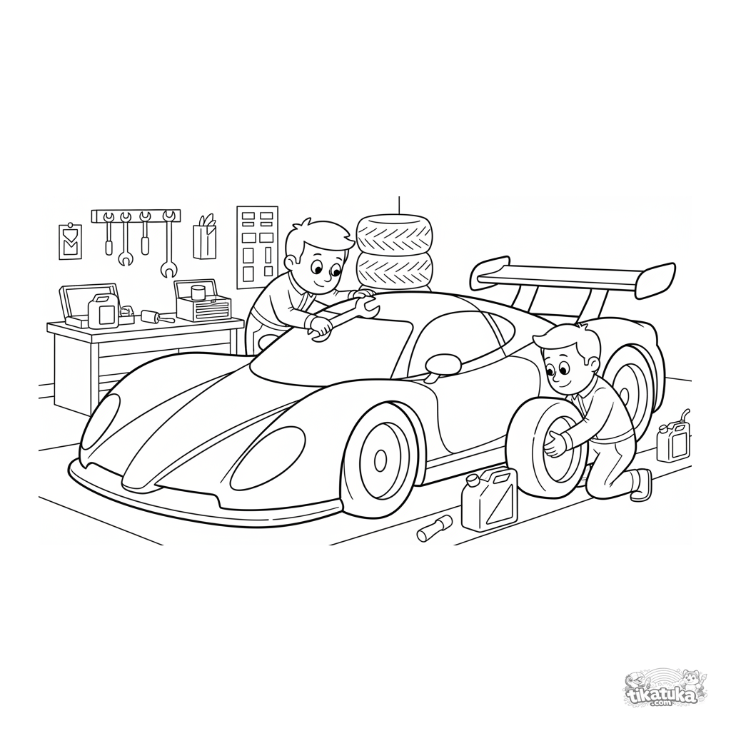 Ausmalbild für Kinder: ein Sportwagen in der Box, Mechaniker bereiten ihn vor. Viele Details: Werkzeuge, Reifen, offene Motorhaube.