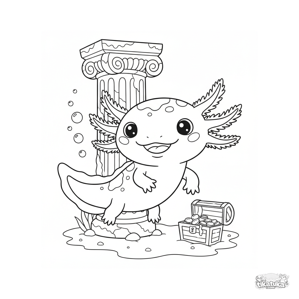 Ausmalbild eines lächelnden, gefleckten Axolotls, der um eine alte Säule schwimmt. Für Kinder von 4-6 Jahren. Unterwasserszene mit Schatz und Blasen.