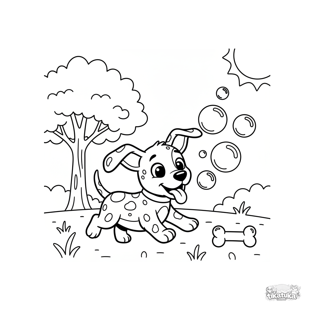 Ausmalbild für Kleinkinder: Ein fröhlicher Dalmatiner-Welpe jagt Seifenblasen in der Sonne. Einfache, große Formen perfekt für 2-4 Jahre.
