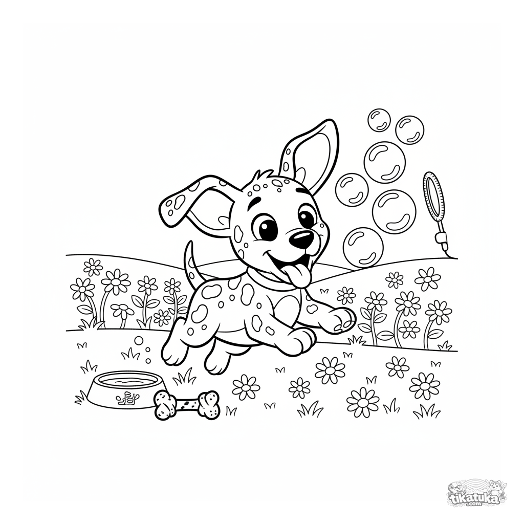 Ausmalbild für Kinder 3-6: Ein verspielter Dalmatiner Welpe jagt Seifenblasen auf einer sonnigen Wiese. Einfache Details für leichtes Ausmalen.