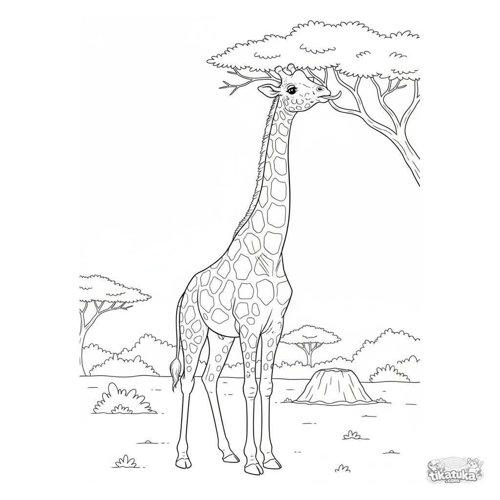Ausmalbild einer Giraffe in der afrikanischen Savanne. Für Kinder von 4-6 Jahren. Die Giraffe greift nach Akazienblättern. Vollkörper sichtbar mit breiten Rändern.