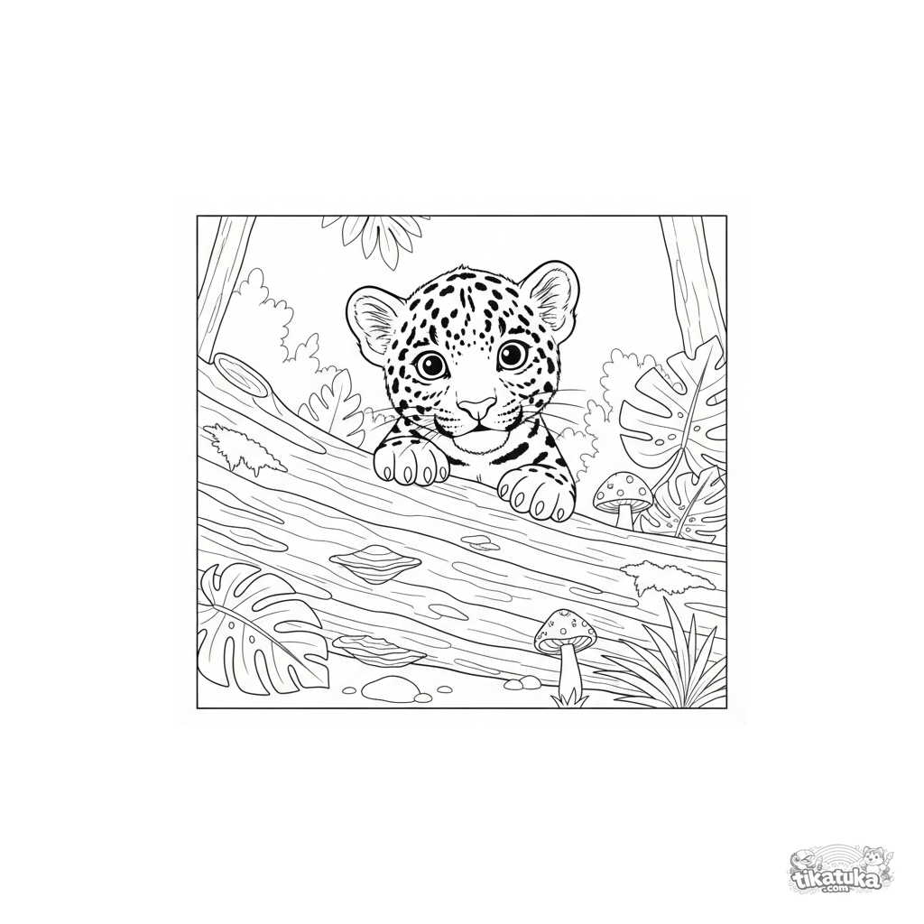 Ausmalbild eines Jaguarjungen für Kinder von 4-6 Jahren. Das gefleckte Kätzchen lugt hinter einem moosigen Baumstumpf im Regenwald hervor.