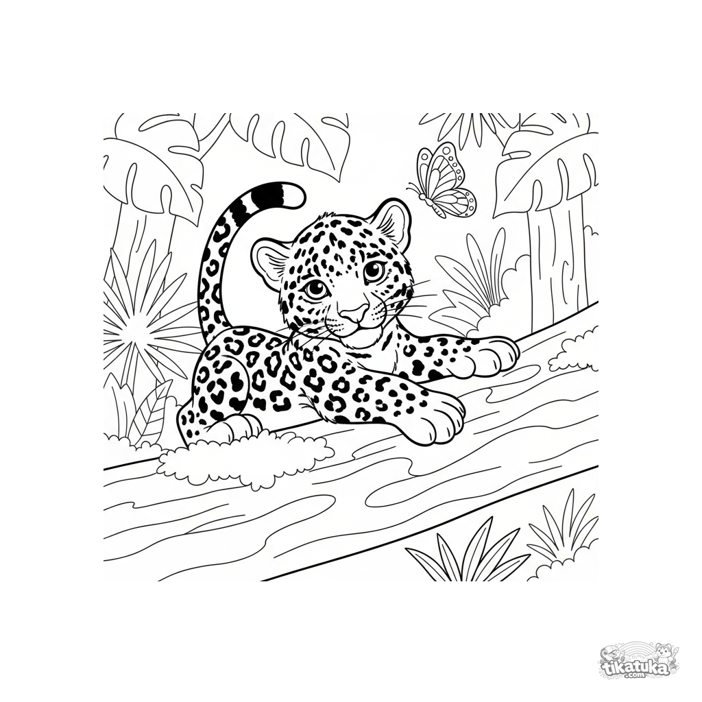 Ausmalbild für Kinder von 4-6 Jahren: ein gepunktetes Jaguar-Junges streckt sich auf einem moosbedeckten Baumstamm in einer sonnigen Dschungellichtung.
