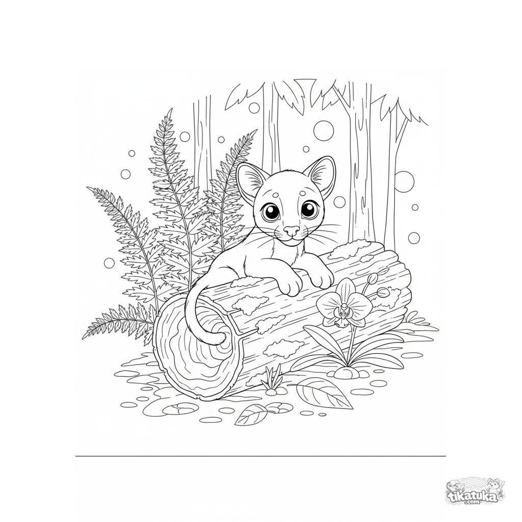 Ausmalbild für Kinder 4-6: Ein seltenes Jaguarundi-Junges lugt vorsichtig aus seinem Versteck in einem hohlen Baumstamm im Regenwald. Einfache Szene mit breiten Rändern zum Ausmalen.