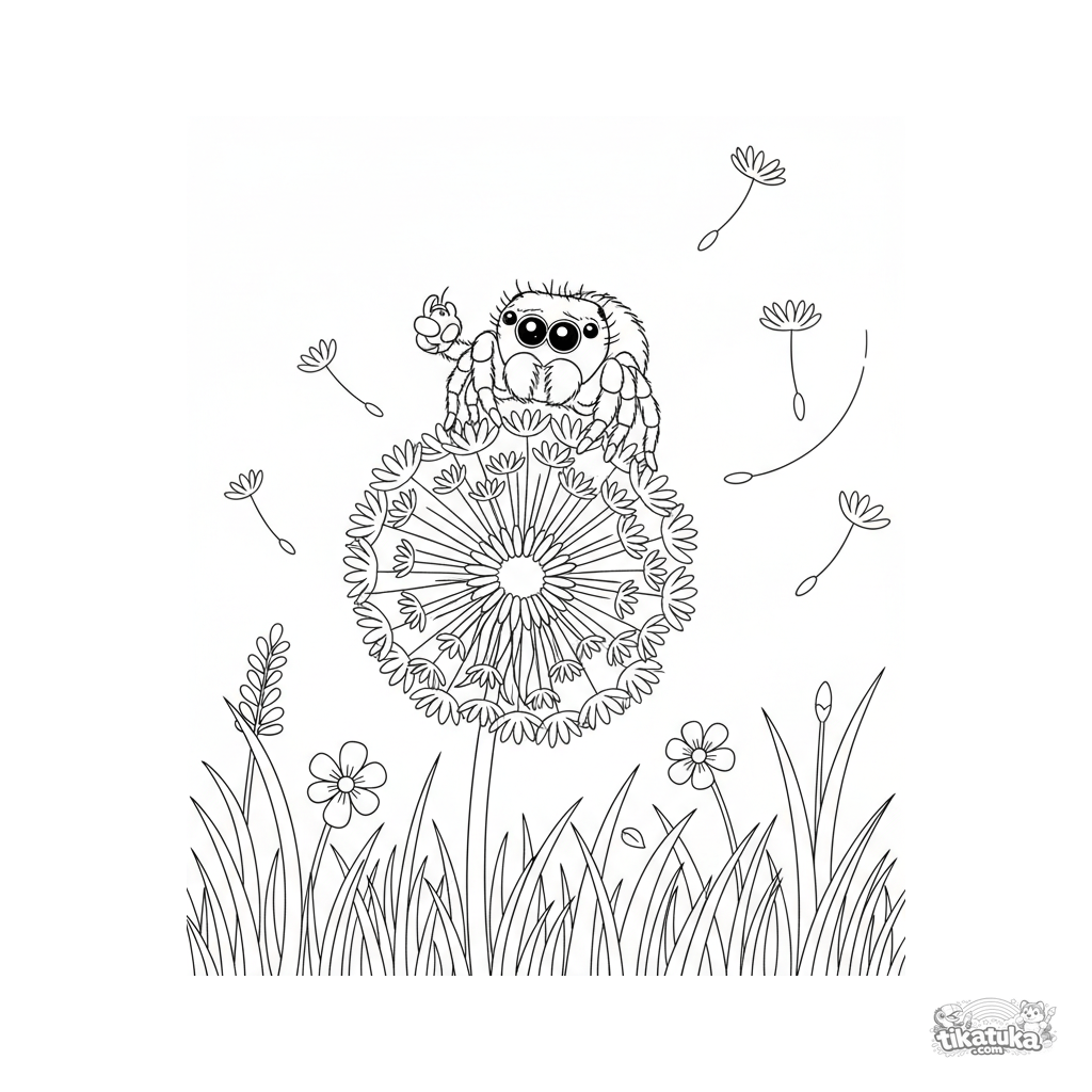 Ausmalbild für Kinder 4-6: eine gepunktete Springspinne sitzt auf einer flauschigen Löwenzahnblüte. Niedliche und detaillierte Naturszene.