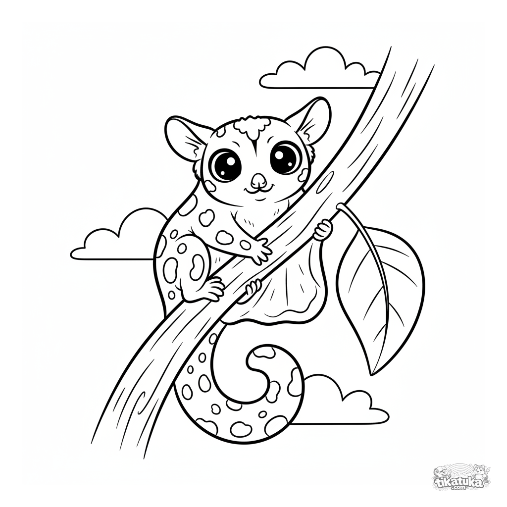 Ausmalbild eines gefleckten Kurzkopfgleitbeutlers, der an einem Eukalyptusast hängt. Für Kinder von 4-6 Jahren. Ein neugieriges, niedliches Beuteltier in einfacher Komposition.