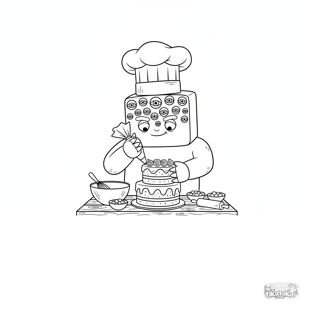 Detailliertes Ausmalbild für Kinder 10-12: Ein quadratisches Monster als Konditor verziert einen mehrschichtigen Kuchen auf einem Picknick. Viele Elemente.