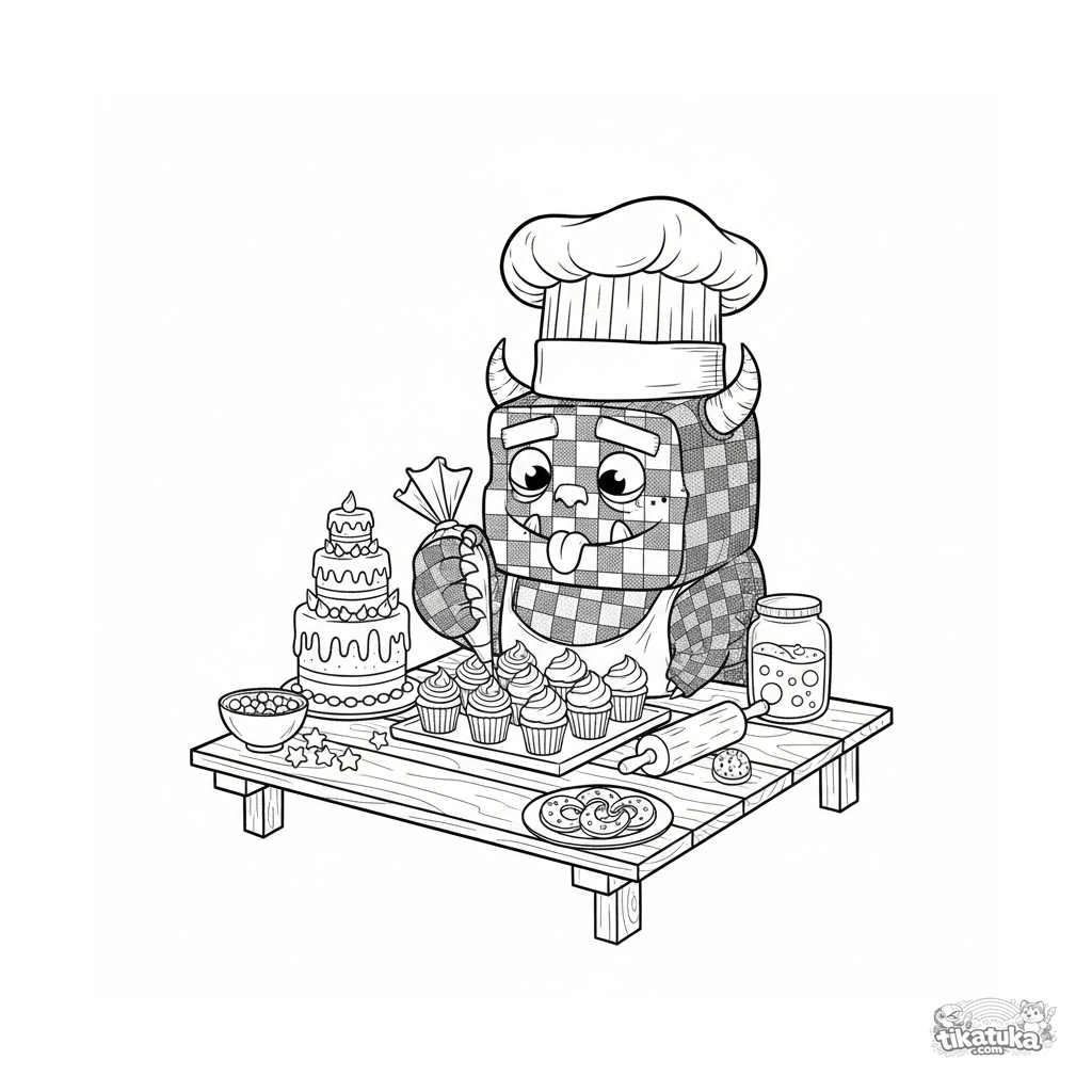 Detailliertes Ausmalbild für 10-12 Jahre: ein quadratisches Monster als Koch dekoriert Cupcakes auf einem Picknick mit Monstersüßigkeiten. Klare Umrisse, viele Elemente.