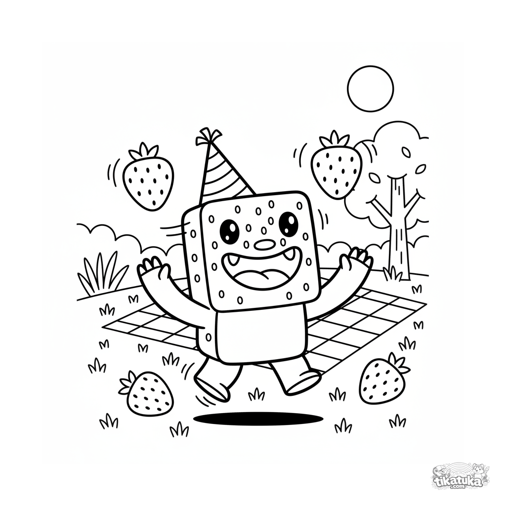 Ausmalbild für Kinder 4-6 Jahre: ein fröhliches quadratisches Monster jongliert mit Erdbeeren auf einer Picknicklichtung. Dynamische Szene.