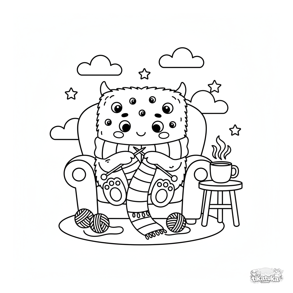 Ausmalbild für Kinder: Ein quadratisches, flauschiges Monster mit vielen Augen strickt einen langen Schal in einem gemütlichen Sessel. Eine ruhige Szene.
