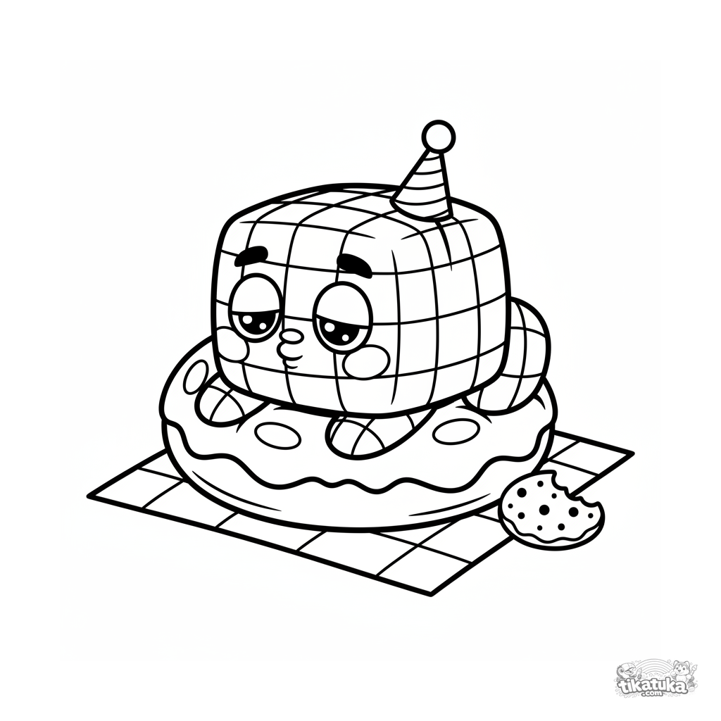 Einfaches Ausmalbild für Kleinkinder: Ein quadratisches Monster schläft auf einem Donut beim Picknick. Große Formen, wenige Details. Für 2-3 Jahre.