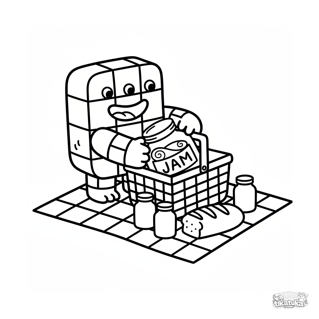 Einfaches Ausmalbild für Kleinkinder 2-3 Jahre: ein quadratisches Monster mit einem Marmeladenglas beim Picknick.