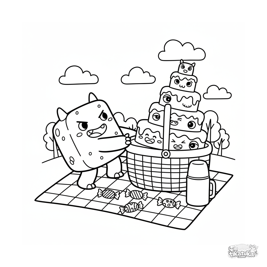 Ausmalbild für Kinder 4-6 Jahre: ein quadratisches Monster mit vielen Augen packt einen Picknickkorb mit einem Kuchen aus.