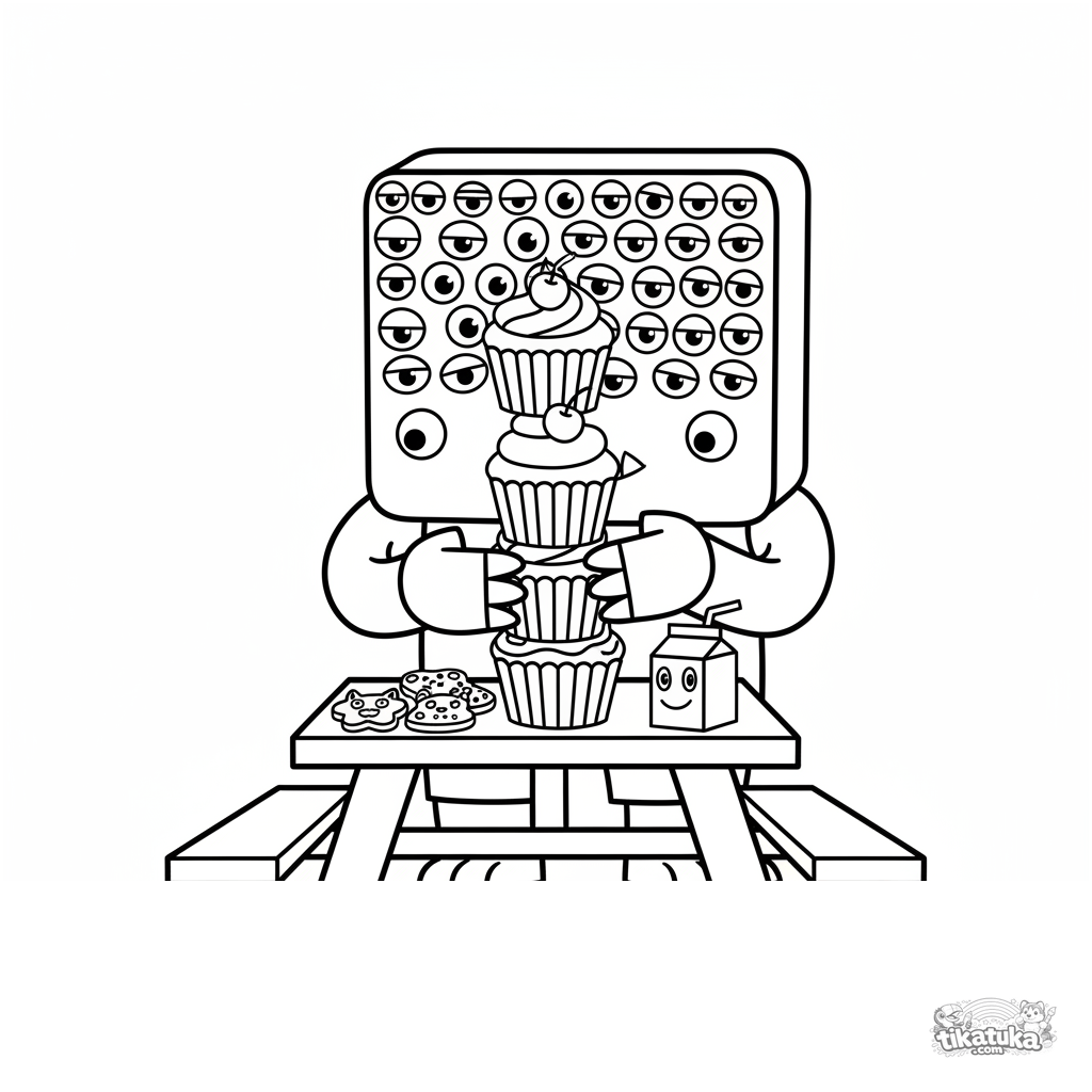 Einfaches Ausmalbild für Kleinkinder: Ein quadratisches Monster baut einen Cupcake-Turm auf einem Picknick. Große Formen, wenige Details.