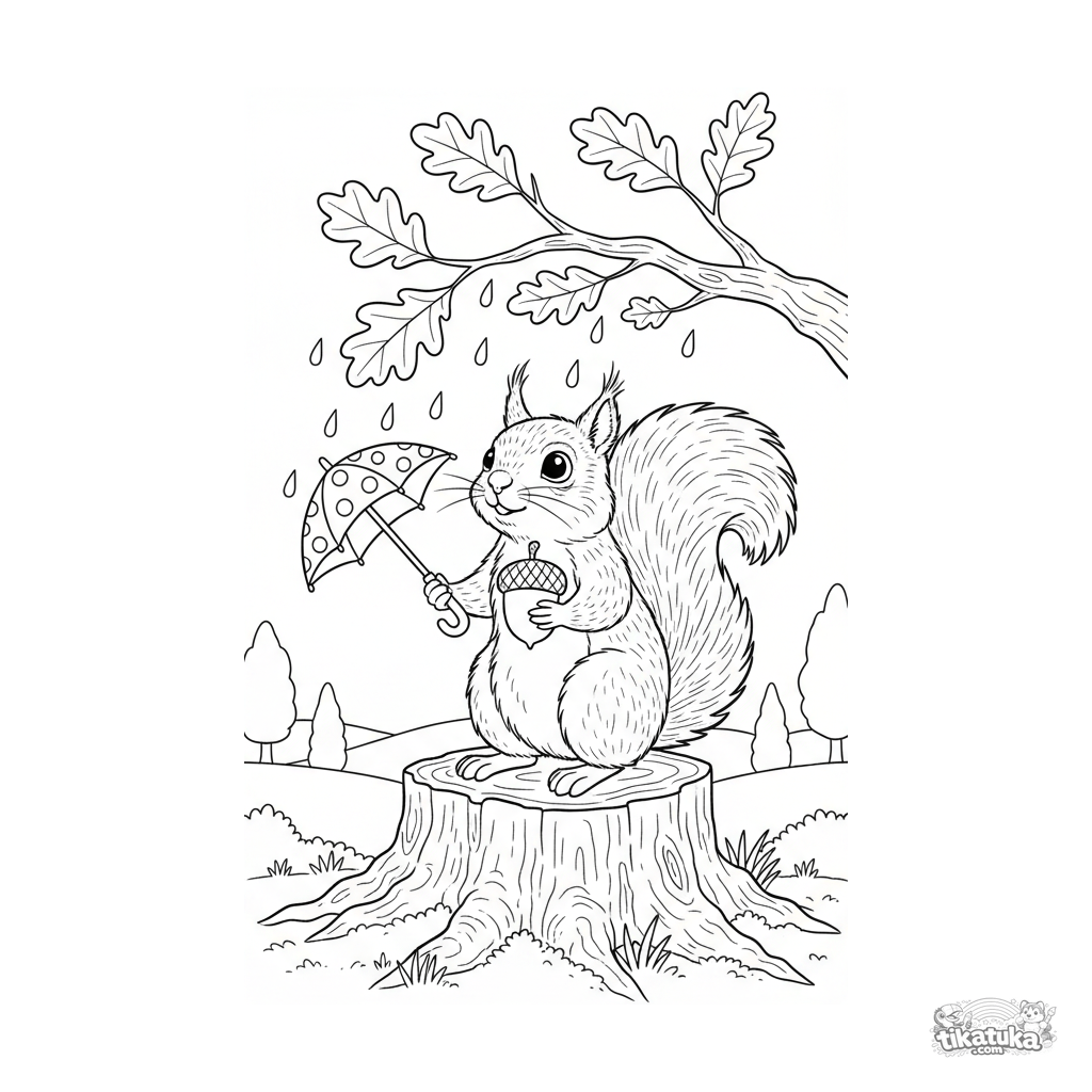 Ausmalbild für Kinder 4-6 Jahre: ein flauschiges Eichhörnchen auf einem Baumstumpf hält einen Regenschirm und eine Eichel unter dem Herbstregen im Wald. Mäßiges Detail.