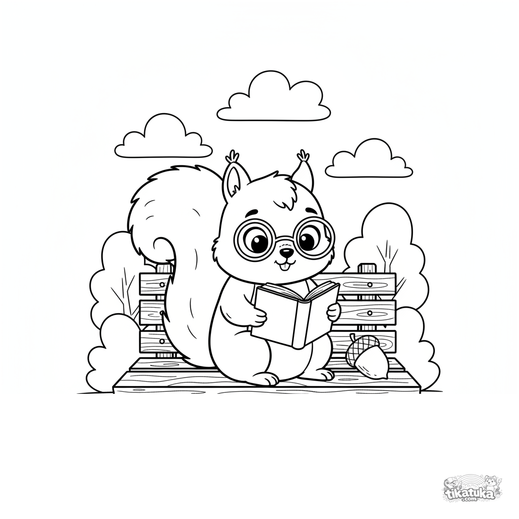 Ausmalbild für Kinder von 7-9 Jahren: Ein Eichhörnchen mit Brille liest konzentriert ein Buch, während es auf einer Parkbank im Stadtpark sitzt.