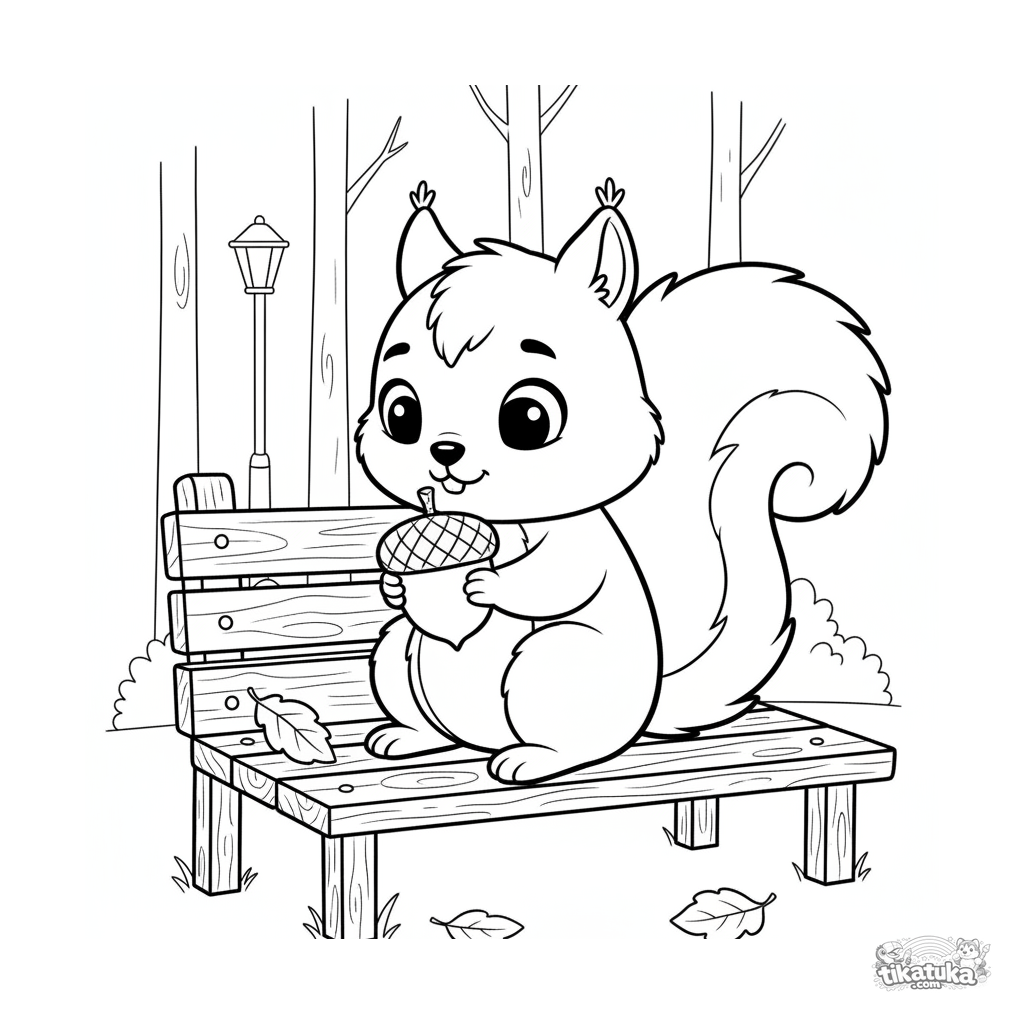 Ausmalbild für Kinder 4-6: Ein Eichhörnchen sitzt auf einer Parkbank und untersucht eine Eichel, mit Herbstblättern ringsum.