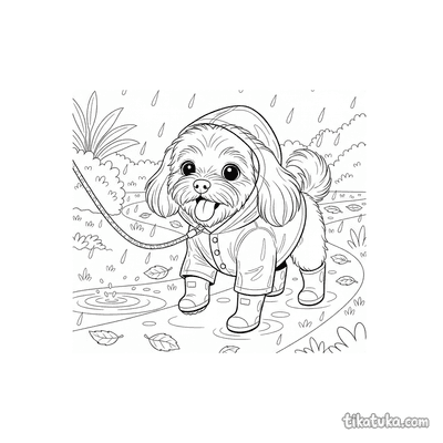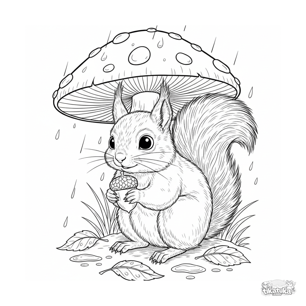 Detailliertes Ausmalbild für Ältere 10-12: Ein junges Eichhörnchen mit einer Eichel sucht Schutz vor dem Regen unter einem großen gefleckten Pilz auf dem feuchten Herbstwaldboden.