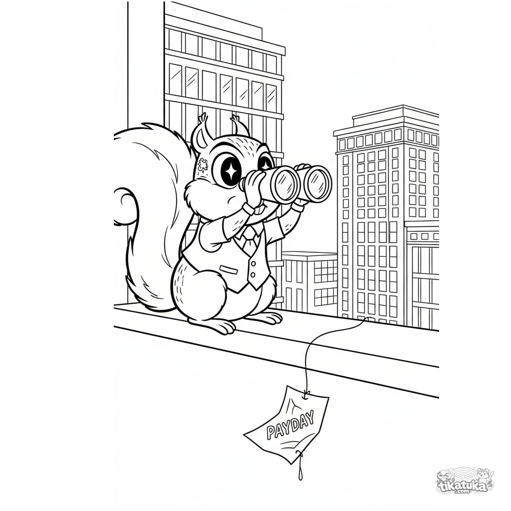 Ausmalbild für Kinder 10-12: Ein Eichhörnchen im Büro-Weste mit Fernglas sucht den Gehaltstag von einem hohen Sims aus. Lustige Internetszene mit Details.